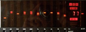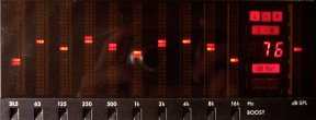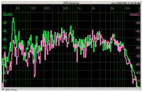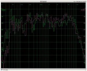 The acoustic pink noise response at the soffit-simulated listening position in our control room at Greenledge Studios on May 23, 2005, HIGH=-4 MID=+0, using PRAXIS @ 1/24 octave, 65536 points. Raw data obtained using a calibrated Beyer MC740N Microphone set to Omni mode (green trace), and a beyer M88 unidirectional microphone (pink trace). Details (1055 x 684) here. |